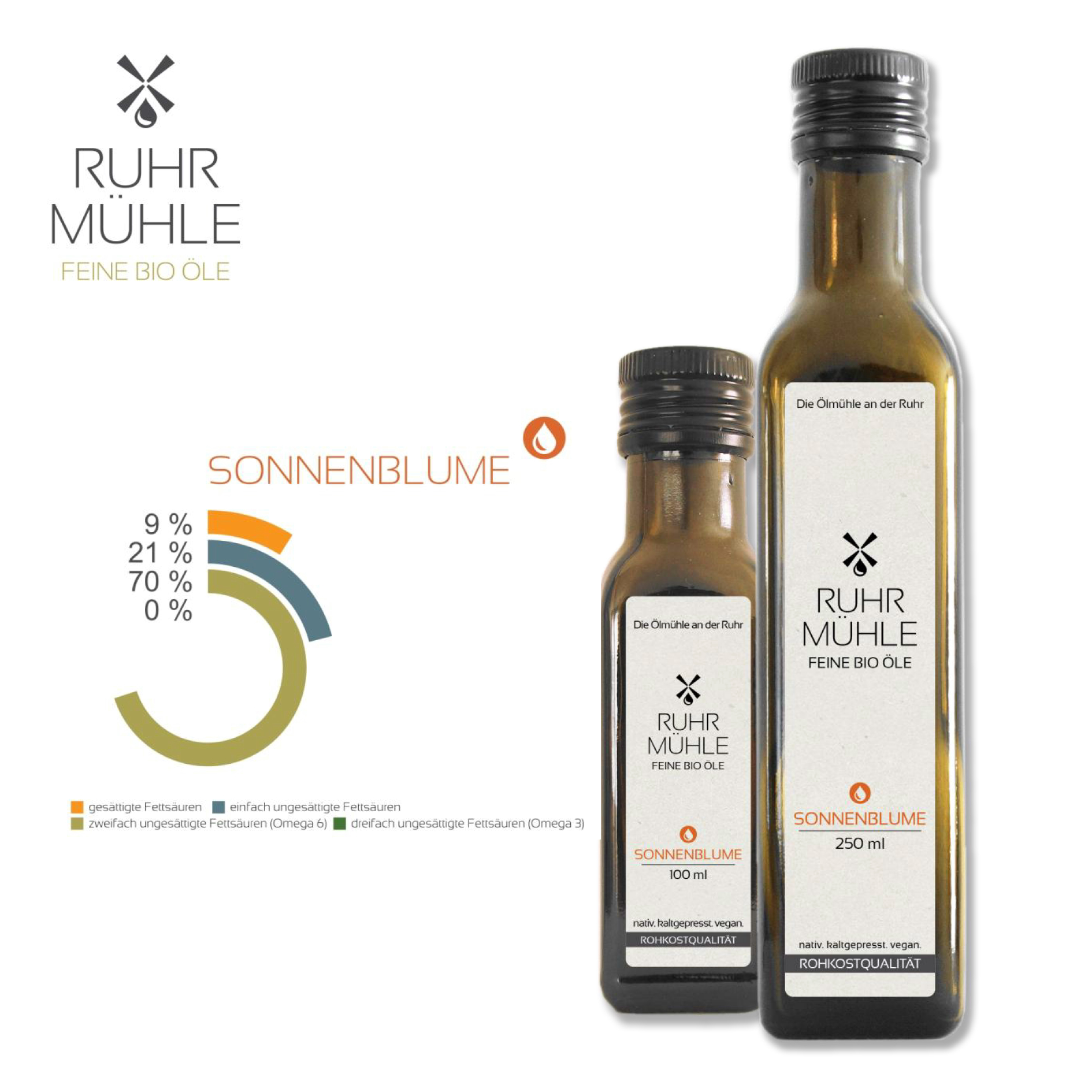 Unser Bio-Sonnenblumenöl wird aus kontrolliert biologisch angebauten und geschälten Sonnenblumenkernen durch kalte Pressung gewonnen. Es enthält vor allem einfach bzw. mehrfach ungesättigte Fettsäuren sowie Vitamin E (Tocopherol). Der Vitamin E-Gehalt beträgt ca. 48 mg pro 100 ml Sonnenblumenkernöl. Sonnenblumenkernöl ist ein bekömmliches Speiseöl und wegen seines milden und angenehmen Geschmacks vielseitig in zum Beispiel Salaten oder warmen Gerichten einsetzbar. Zum Braten ist das Sonnenblumenöl auf Grund des hohen Gehalts an mehrfach ungesättigten Fettsäuren nicht geeignet.